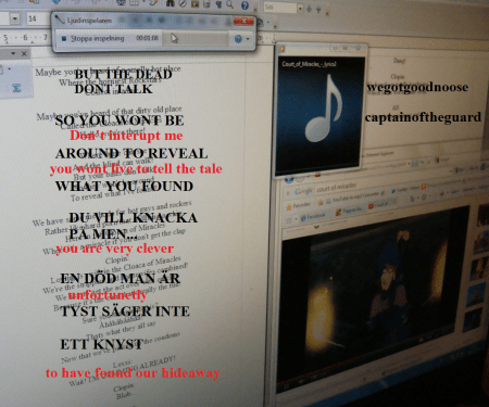 Either way, once I gotten this far.. the rage hade no end. It’s probably just me, but there is nothing I am more inpatient with than editing. I used three lines to begin with, one for my vocals, one for karaoke and one for the actual song to make sure everything fits in correctly and on the right places (especially around ‘Justice is swift…’ and ‘Now that’ we’ve seen all the evidence…’) I figured I was done, and I muted the original track to listen through… only to realize… The program itself had cut off the first words in “We have a method…” and “Any last words…” (yes, I put the original lyrics here not to spoil the song, uhuh) So I had to start over, placing it all over the place. Eventually, I managed to get shit together.