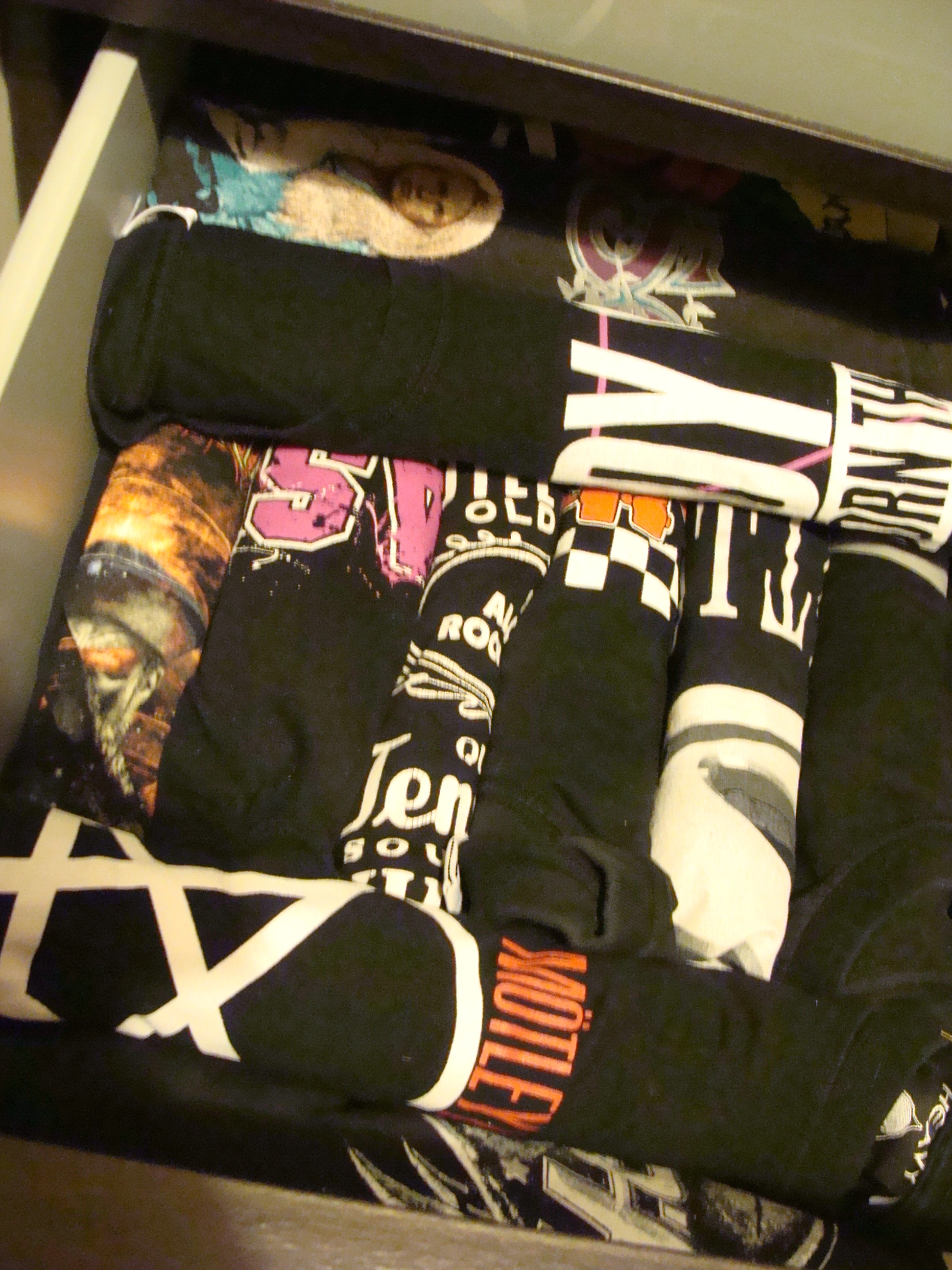 I read on a website some long time ago that the best way to keep your bandshirts is by folding them one time, and then roll them. By that, you’ll both see what bandshirt it is AND what size it is (if this matters). Helps out a lot, AND in all honesty… it does make the drawer look a lot neater.