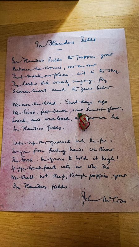 The poem “In Flanders Fields” together with a poppy+ Sabaton Logo pin. The Poppies are a memorial symbol for the people who lost their lives in the World War I.