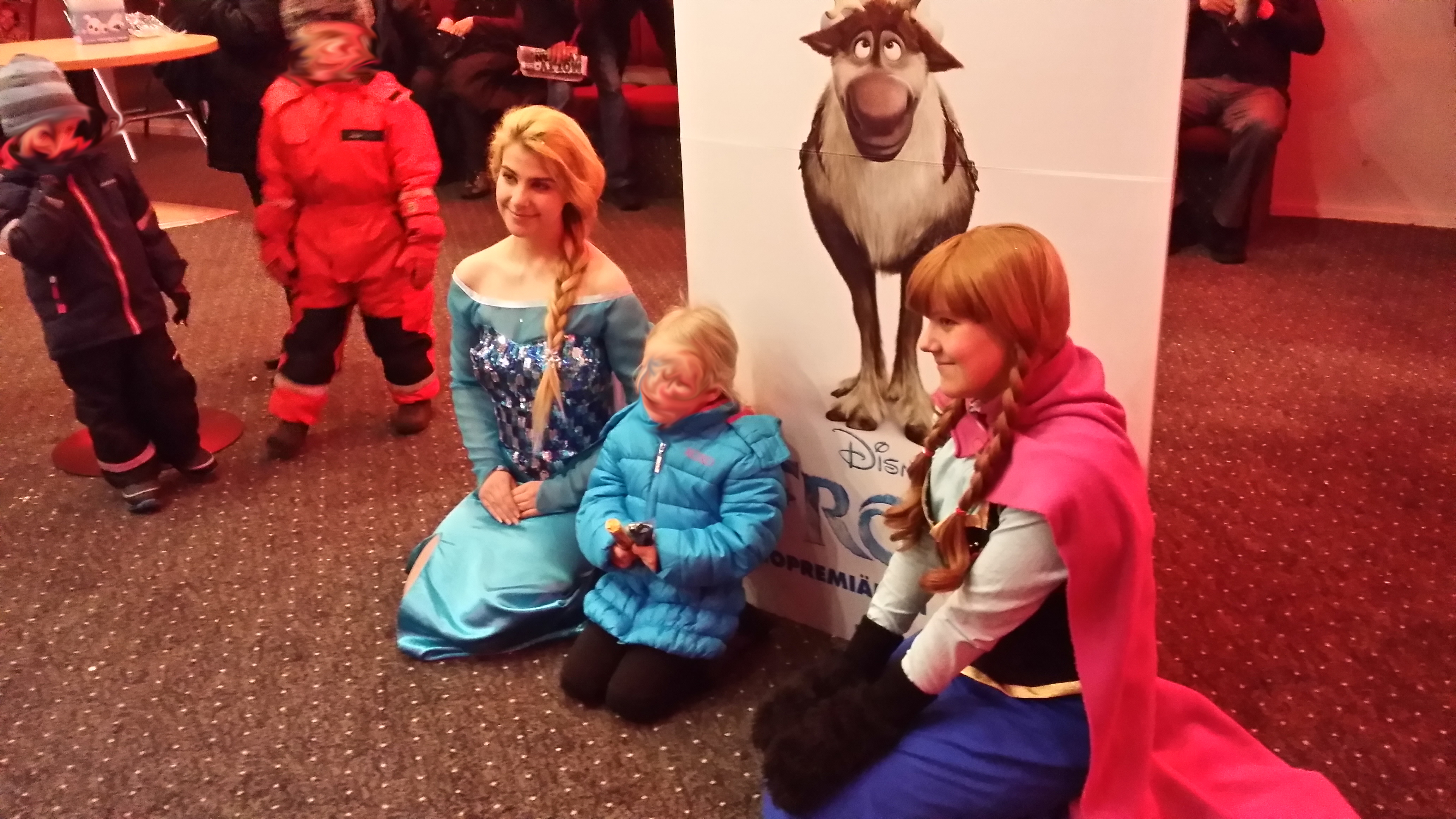 We changed into our REAL gear during dinner, and I might just add one thing. With our luck, we were of course extremely late. First of all, we were late leaving Jennie’s place, and then we had to go and pick up Kim on the way. So we literally had to inhale the food and then run to the movies to pick up Frozen-menues. Of course, I had one with Elsa, Jennie with Anna and Jonny went with a Kristoff as he had been given Kristoff as his “character”.